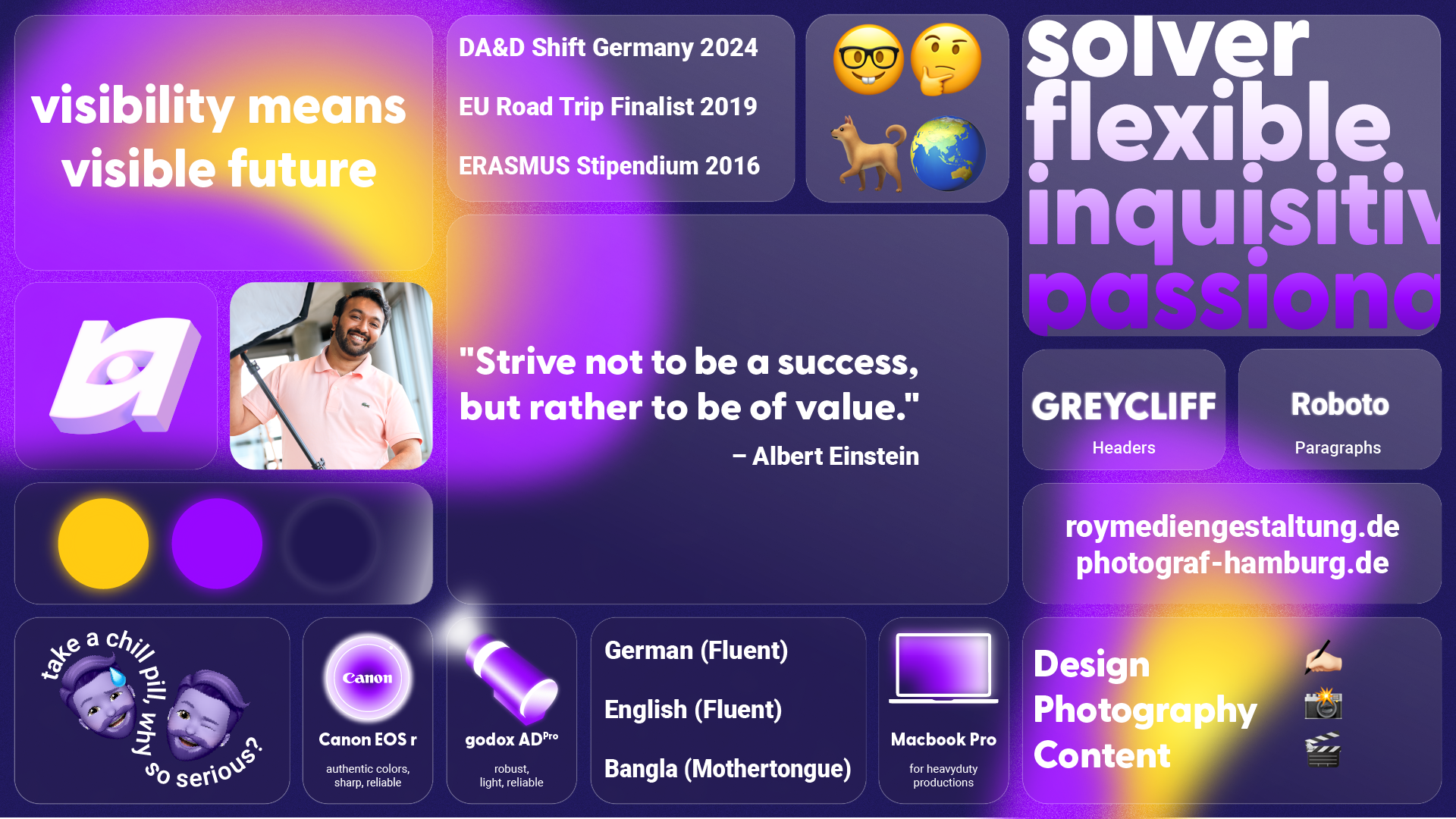 Nachdem ich für verschiedene Unternehmen und Agenturen gearbeitet hatte, gründete ich im Jahr 2017 Roy Mediengestaltung um außergewöhnliche Branding und Marketingsupport für lokale und internationale Marken anzubieten. Mein ultimatives Ziel ist es, meinen Kunden durch die Kraft von authentischem visuellem Storytelling dabei zu helfen ihr volles Potenzial zu erreichen.